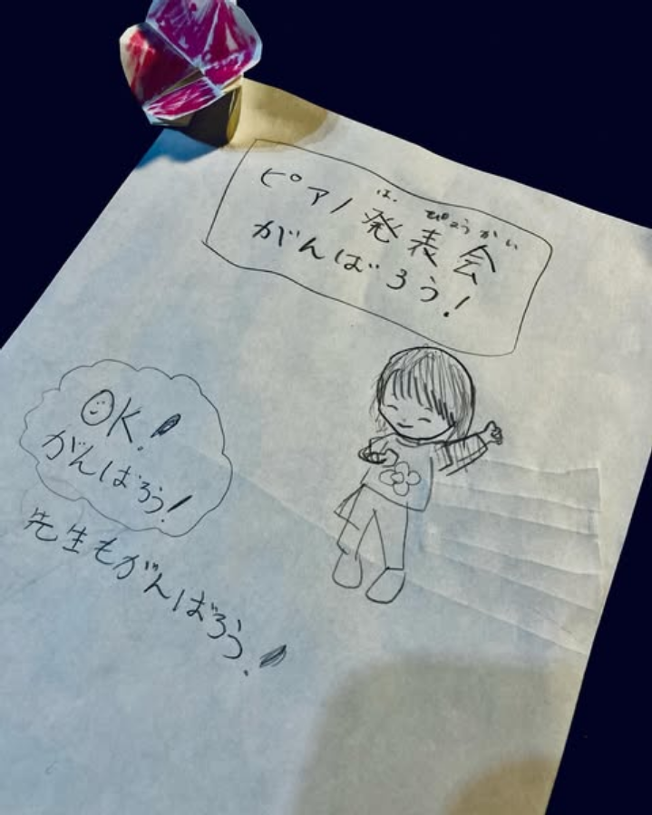 そう、本当にもう近づいて来ちゃいましたね。ほぼあと1ヵ月ですね。たくさん練習して当日は思い切って楽しく演奏できるようにしましょう。独奏だけの人もあり、連弾もやる人もあります。今回は兄弟、姉妹、親子の連弾も取り入れました。(絵は教室のラクガキ帳に生徒が描いたものです。めちゃくちゃ上手。でも誰が描いたのかなあ。。。)
